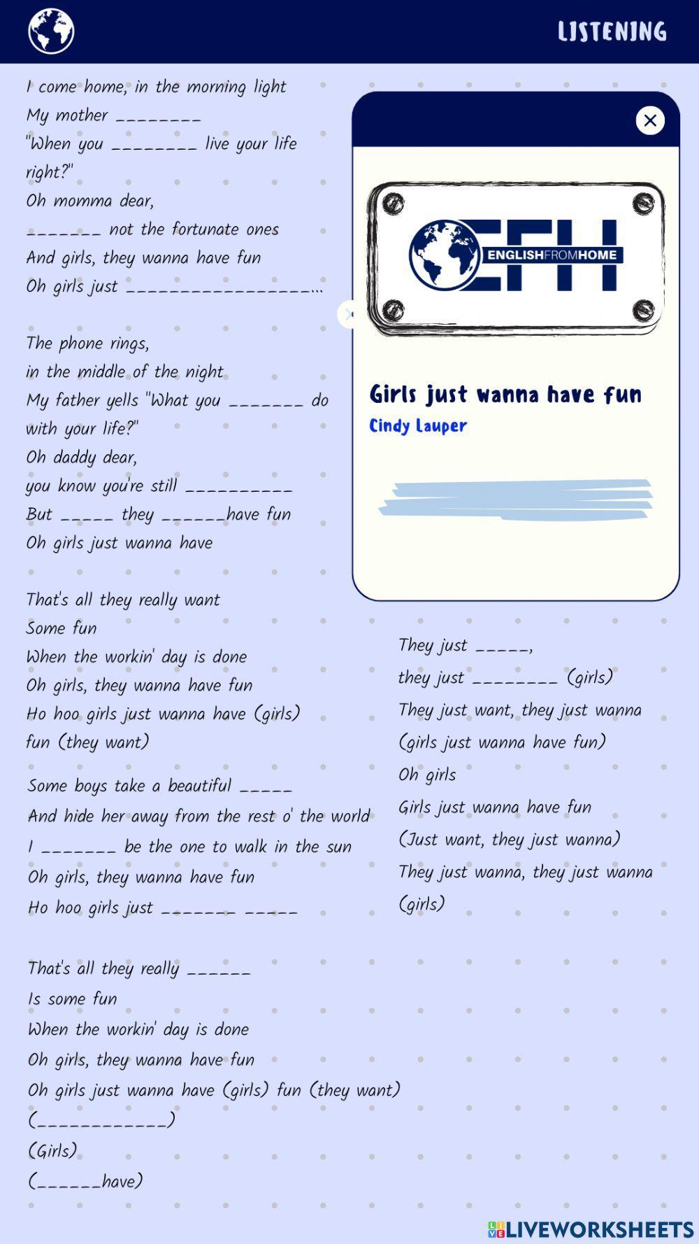 Listening Girls Just Wanna Have Fun Worksheet Live Worksheets